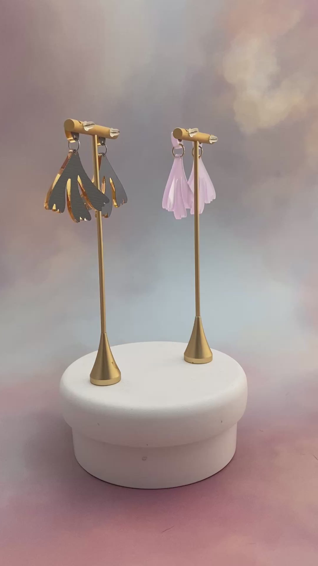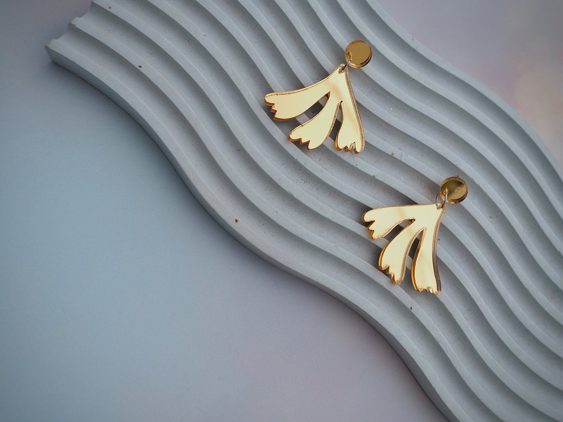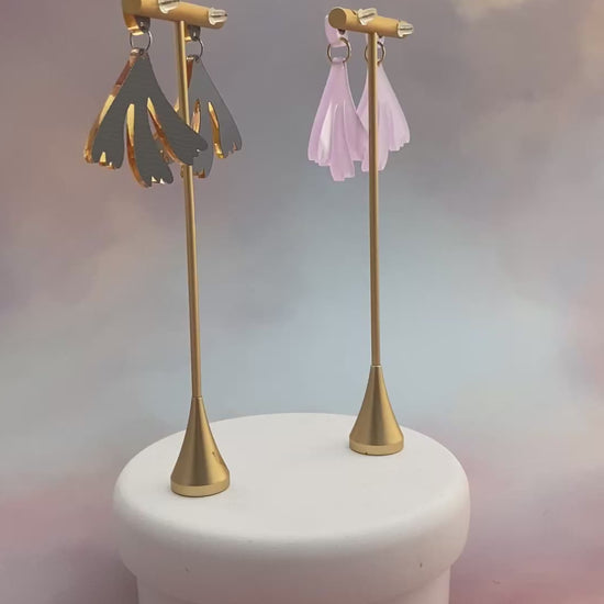 Posts are hypoallergenic surgical steel. Earrings come in two different color options: Wisteria purple or Gold mirror