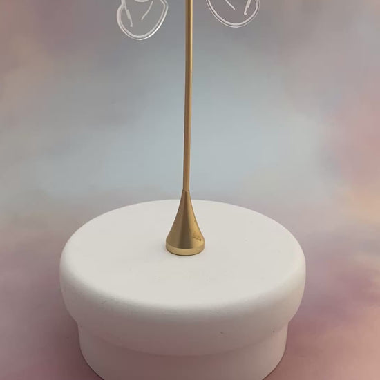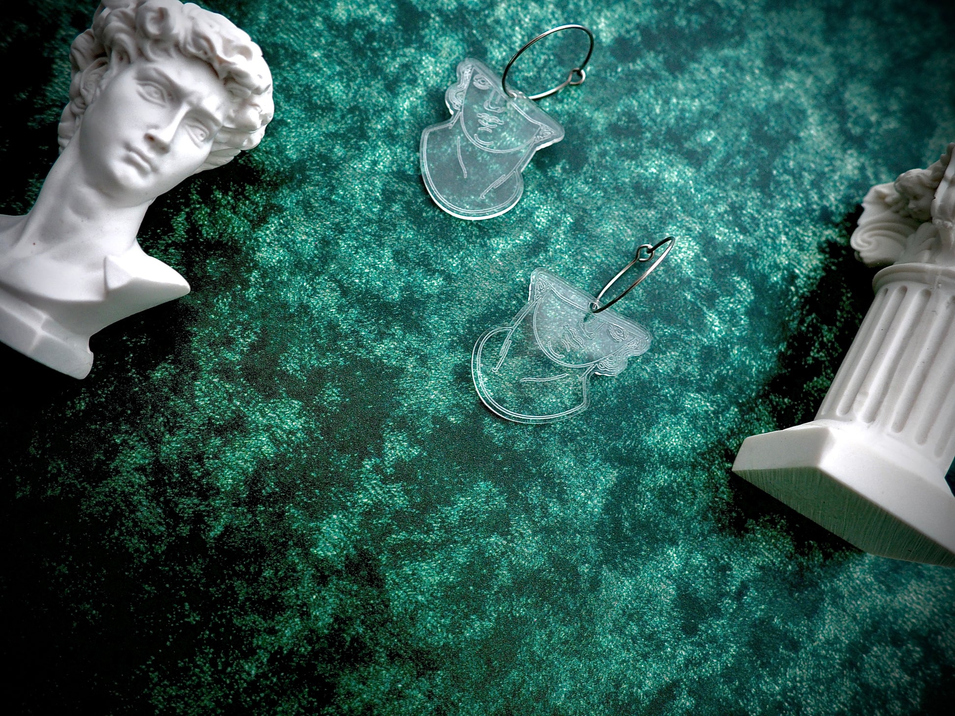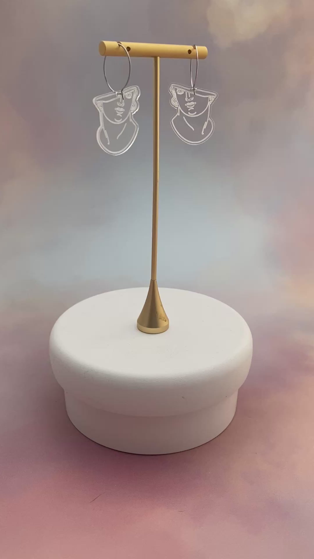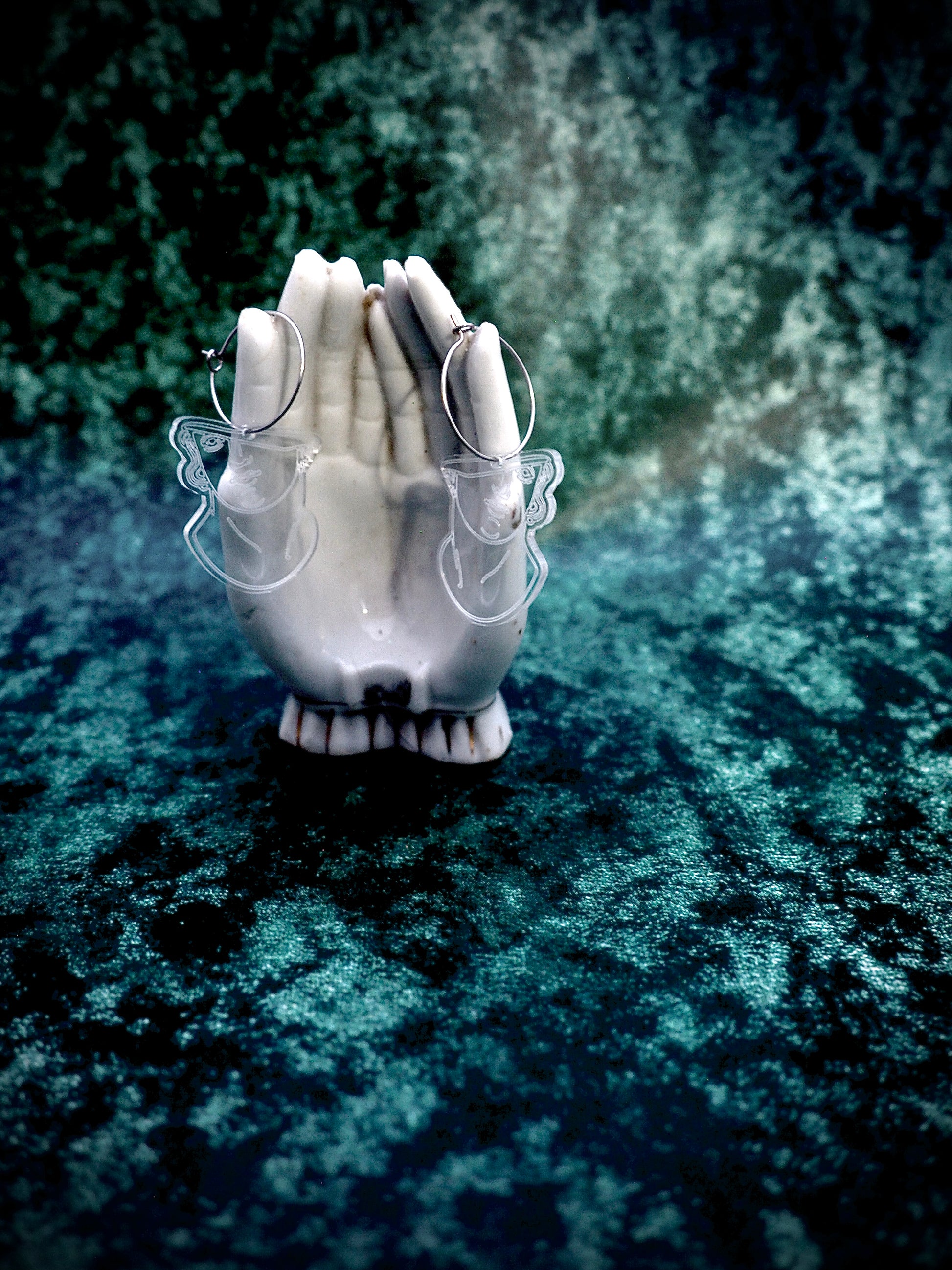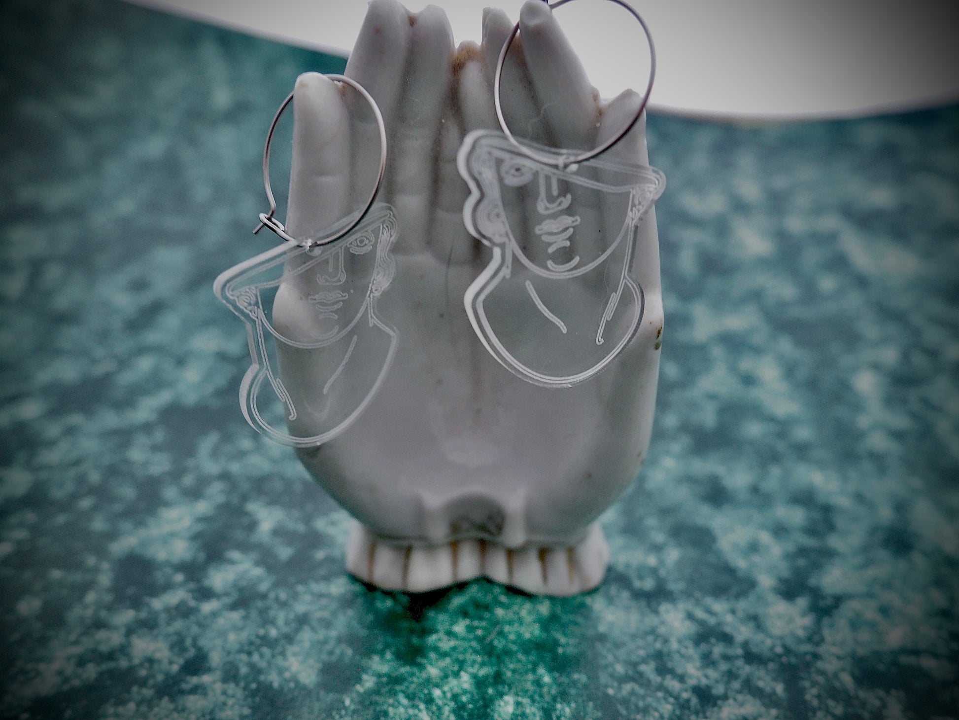 Earrings are made of engraved clear acrylic and come on hypo-allergenic surgical steel hoops as shown.